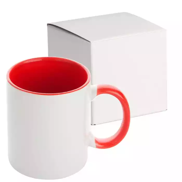 Cană clasică din ceramică albă, cu Interiorul si manerul rosu, calitate AA, tratată cu un strat de lac special pentru procesul de sublimare. Este un produs de bază pentru orice atelier de personalizare, oferind o suprafață lucioasă care asigură o aderență optimă a cernelii și culori intense după transfer.